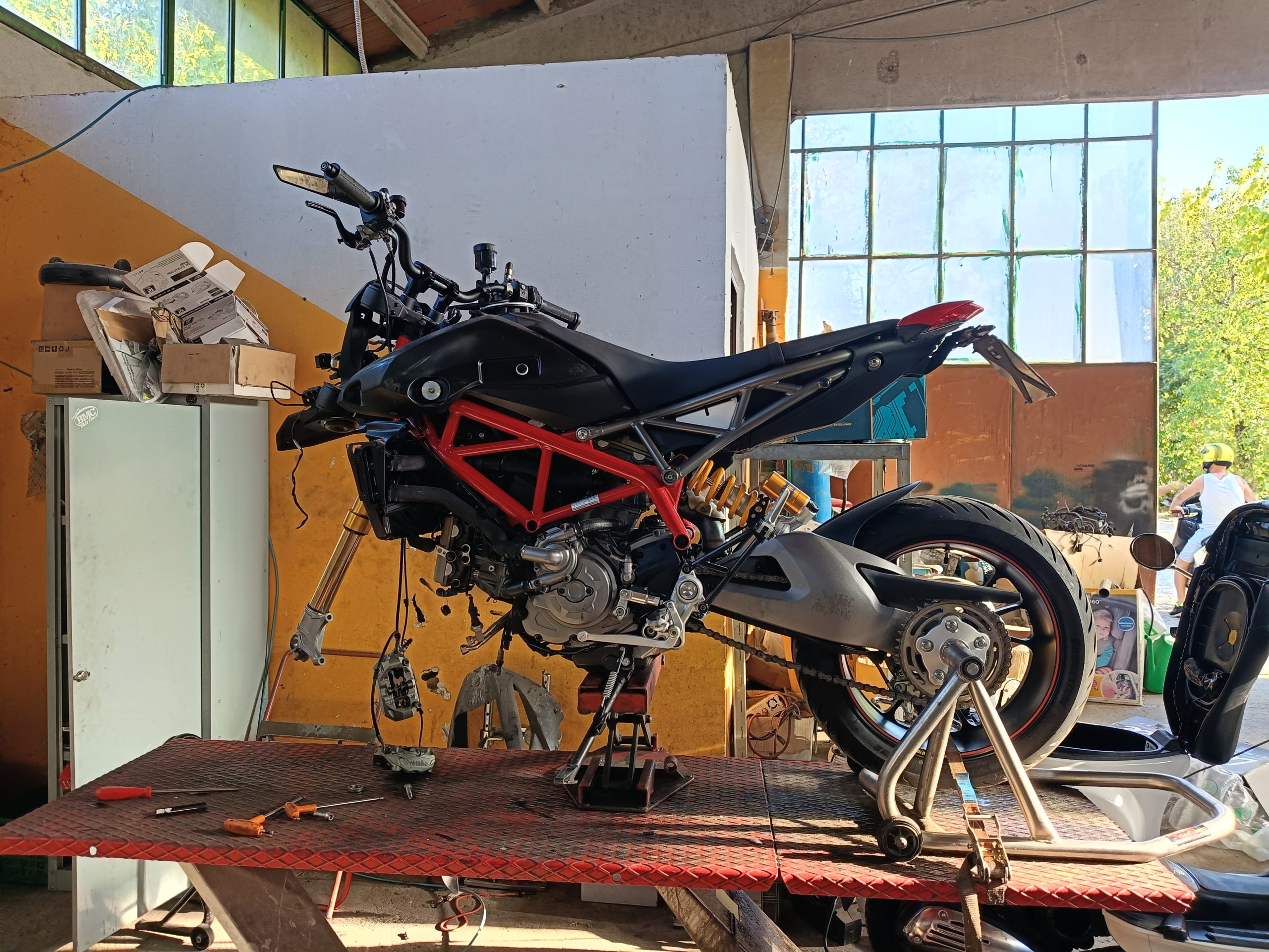 Entrare nell’officina di Luca Trillini è come fare un tuffo nel cuore pulsante della passione motociclistica. L’atmosfera è un mix affascinante di caos e ordine, dove ogni angolo racconta una storia. Gli scaffali sono colmi di pezzi di ricambio, caschi, e memorabilia che evocano l’epoca d’oro delle moto. Non troverete insegne luminose, ma il calore di un luogo autentico, dove il rombo dei motori è musica per le orecchie degli appassionati.